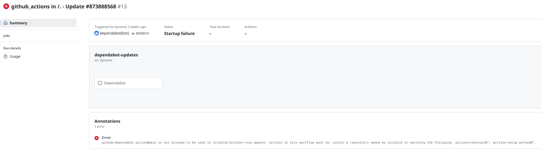 Why is simple in this case. I've restricted which actions are allowed(rather pointless in my case), however it didn't occur to me that dependabot is one as well. I guess have I allowed “Allow actions created by GitHub”, even “Allow actions by Marketplace verified creators” might do, there wouldn't be a problem